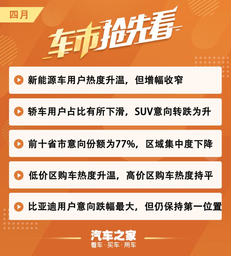 ■ 分車型級別走勢:轎車用戶占比有所下滑,SUV意向轉跌為升 4月,新能源車中轎車、SUV、MPV用戶購車意向占比分別為62.2%、36.2%、1.7%。轎車用戶意向占比相較上月下降0.6個百分點,份額開始回落。SUV用戶意向占比開始轉跌為升,環比增加0.8個百分點。MPV用戶意向占比4月環比降低0.2個百分點,意向占比仍較低。 ■ 分區域走勢:前十省市意向份額為77%,市場區域集中度下降 今年4月,用戶購車意向占比最高的5個省份包括廣東、北京、上海、浙江、河南,廣東以16.0%的意向占比獨居鰲頭。用戶購車意向TOP 10省份意向份額累計達77.0%,相較上月降低1個百分點,市場區域集中度有所下降。 上述10個省份中,用戶意向占比有所增長的有9個,其中廣東用戶意向增加0.5%,蟬聯意向占比增長較高的省份,這可能與當地政府發布了一系列支持政策有關。僅北京一個省份下滑,下滑幅度為4.2%。 了解了用戶購車意向的省份分布,我們再來看一下城市格局。今年4月,非限購城市的用戶意向占比達50.4%,仍居市場主力。用戶購車意向占比最高的5個城市包括北京、上海、深圳、廣州、天津,北京以15.7%的意向占比榮登榜首,大幅甩開其他城市。 TOP10城市用戶意向占比累計達56.2%,相較上月降低1.4個百分點,市場城市集中度有所下降。上述10個城市中,除北京外,其他所有城市用戶意向占比都有所增長(或持平),體現市場向好發展。 ■ 分價區走勢:低價區購車熱度升溫,高價區購車熱度基本持平 價格是用戶購車時最主要的考慮因素之一,那么用戶對不同價位車型的意向度究竟如何?今年4月,12萬以下價區用戶購車意向占比為25.1%,相較上月增加2.1個百分點;12-20萬價區用戶購車意向占比達32.2%,對比上月下滑2.7%;20-30萬價區用戶意向占比為21.1%,相較上月上漲1%個百分點;30-50萬價區用戶意向占比為12.9%,比上月降低0.4個百分點;50萬以上價區用戶意向占比為8.6%,較上月保持穩定不變。 通過分析近12個月的用戶意向數據發現,2019年5月至今年4月,12萬以下價區用戶意向占比增加2個百分點,低價市場熱度有所升溫;12-20萬價區用戶意向占比上漲5%,市場熱度保持較大幅度增長;20萬以上價區用戶意向占比,下跌7.1個百分點,其中,20-30萬價區市場熱度下滑明顯,近12個月線索占比下跌11.1%。未來,隨著新能源車型的布局更全面,市場將進一步細分,價區覆蓋也會更加均勻。 ■ 分廠商走勢:比亞迪用戶意向跌幅最大,但仍保持榜首 在日趨激烈的市場競爭中,各車企對于用戶的爭奪也是愈演愈烈。縱觀4月市場,TOP 10廠商用戶購車意向占比累計達54.8%,相較上月份額增加0.7個百分點,市場集中度進一步提升。十個廠商中,有6個廠商用戶意向占比實現上漲,份額增幅最大的廠商為長城汽車,以1.8%的增幅領漲TOP 10廠商;跌幅最大的廠商為比亞迪,下降比例為1.6%,不過依然霸占市場榜首位置。 ■ 用戶意向偏好:女神更愛轎車,男神更愛大車 不同特征的用戶,其汽車消費偏好存在一定差異,那么性別的差異會對用戶意向帶來哪些變化,一起來看一下。通過分析用戶意向數據,可以看到,女性用戶比男性用戶,對于轎車的偏好更強,在4月女性用戶來源的購車意向數據中,轎車占比為69.2%,比男性轎車購車意向占比高8.0個百分點。相反,男性用戶更偏好空間大、外形硬朗的車型,男性SUV購車意向占比比女性高8.2個百分點。與上月相比,女性用戶來源的SUV、MPV購車意向占比有所下滑,而轎車購車意向占比存在一定上漲;男性用戶來源的轎車、MPV購車意向占比下跌,而SUV意向份額有所增加。 對于新能源車,愛車的男神、女神到底誰最愛一擲千金?今年4月,男性在12萬以下價區的購車意向占比為25.6%,而女性為33.7%,在低價區中男性份額比女性低8.1個百分點。在12-20萬價區中,女性購車意向占比相較男性,低5.5%。在20萬以上價區,女性購車意向占比,比男性低2.6個百分點,但女性相較其上月購車意向占比實現了增長,在50萬以上價區,女性比男性分別高2.1%。 ■ 總結 整體來看,4月新能源車市正在進一步復蘇,其中消費者對于中國品牌的熱度還在升溫,意向占比增加了1.4個百分點,達到63.3%。特斯拉在降價熱度過去后,整體熱度也有所下滑。不過今年5月1日,特斯拉又迎來新一輪降價,其5月車市熱度有望提升。未來,隨著新能源車型的增多,市場競爭會加劇,產品也會日益成熟。而作為消費者,你會選擇新能源嗎?(文/汽車之家 數說行業) |